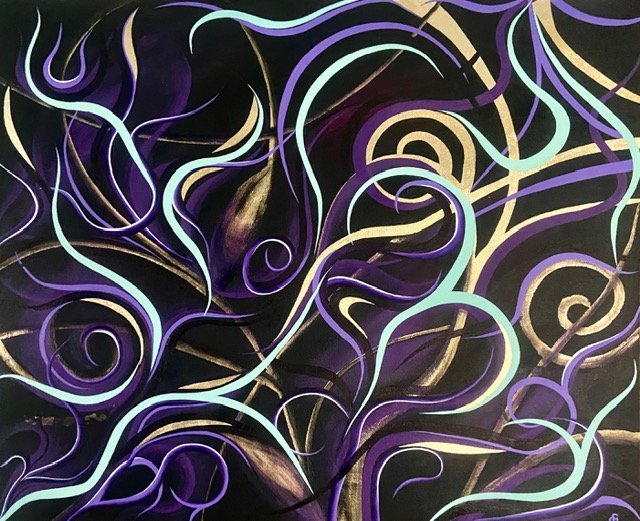 Violet Mirage unfolds in flowing hues of violet, turquoise, and blue, a meditative interplay of movement and light.